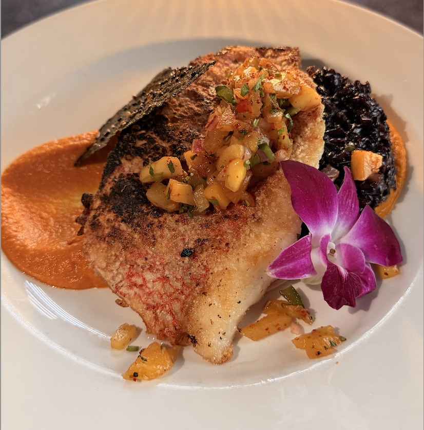 Pan Seared Red Snapper | Black Rice | Carrot Puree | Pineapple Succotash | Seaweed Crisp
